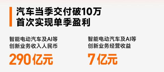 智能电动汽车及 AI 等创新业务分部收入 290 亿元,同比增长超 199%。其中智能电动汽车收入 283 亿元,其他相关收入 7 亿元,并且本季度小米汽车及 AI 等创新业务分部首次实现单季度经营收益转正,实现单季经营收益 7 亿元。