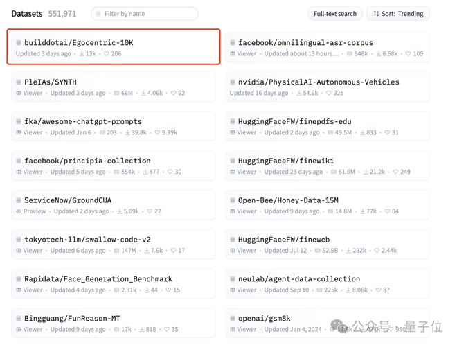 发布不到三天,Egocentric-10K 在 Hugging Face 的下载量就突破了1. 3w次,并登顶趋势榜。