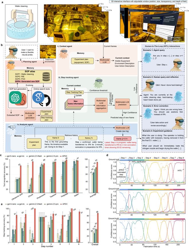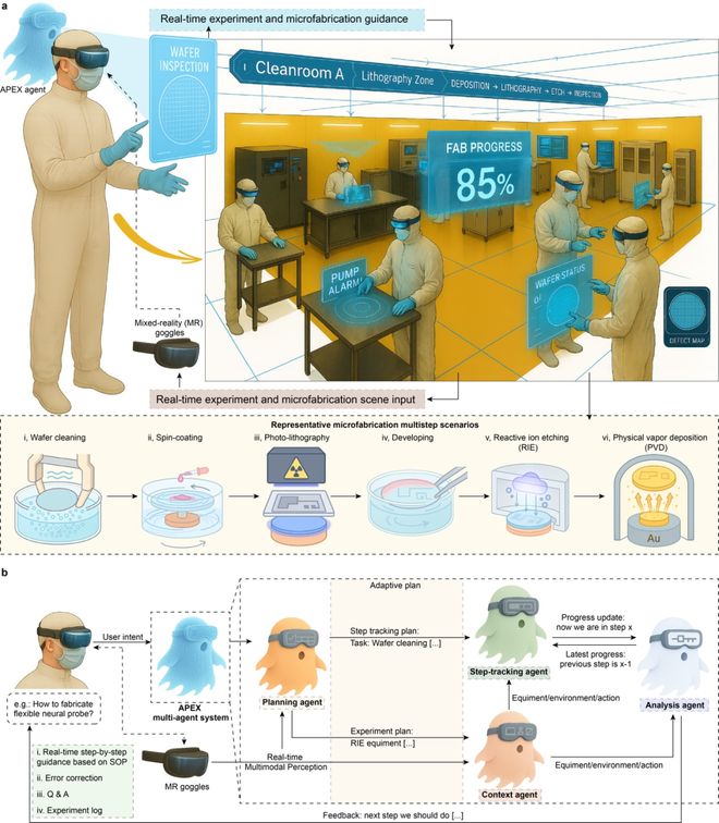 APEX 人机共融界面,通过多智能体协作实现超净间里芯片制备阶段识别、操作纠错与实时指导,支持芯片制备的闭环协作