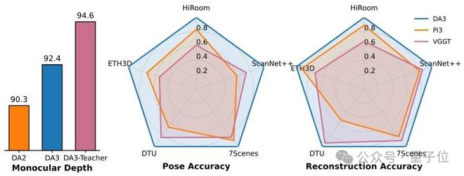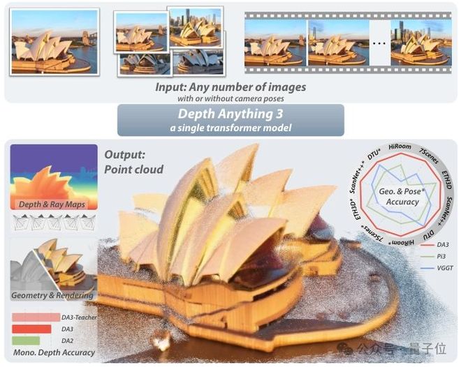 而且,它在团队全新打造的视觉几何基准上横扫所有任务,相机定位精度平均提升35. 7%,几何重建准确率涨了23. 6%,单目深度估计还超越了自家前代 DA2。