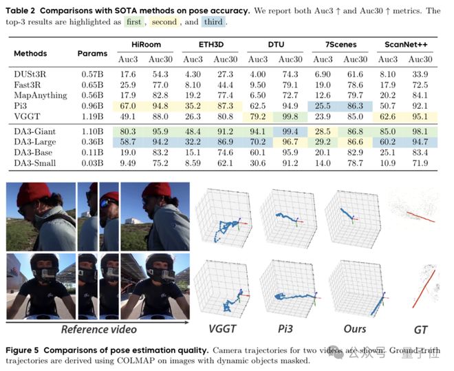 评测结果就是 DA3 全程能打。给一段视频,它能精准估计每帧的相机内参与外参,还原每帧相机的运动轨迹;