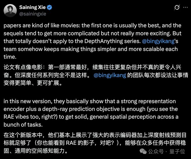 这是字节 Seed 康炳易团队带来的最新研究成果 Depth Anything 3(下称 DA3),获谢赛宁盛赞。