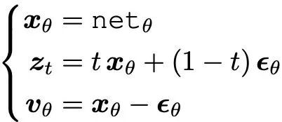 由于三者(x、ϵ、v)之间彼此依赖,只需设定一个网络输出,同时结合另外两个约束条件,即可推导出其余两个变量。