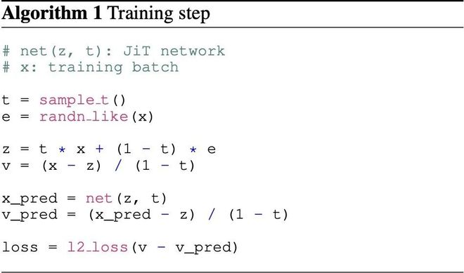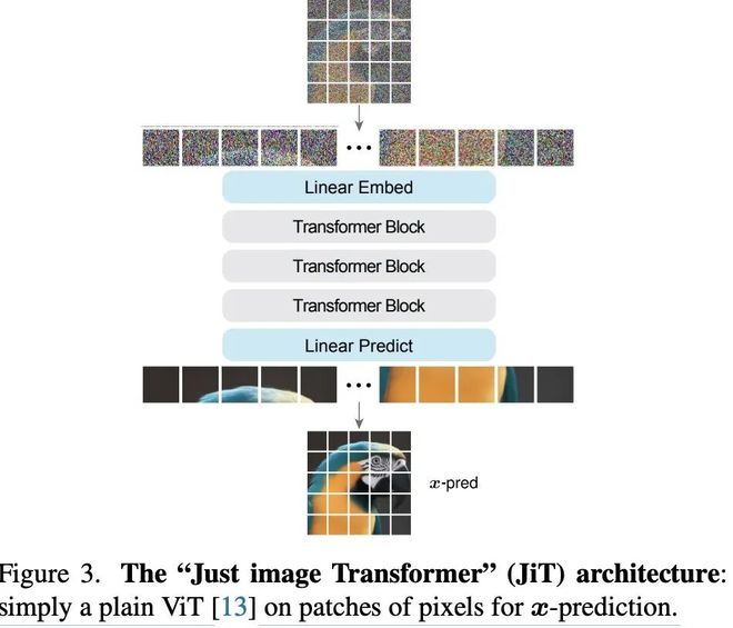 如图 3 所示,这种结构与 DiT(Diffusion Transformer)非常相似,但核心差别在于:JiT直接在原始像素上建模,完全依赖x预测。