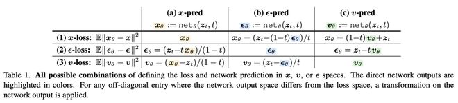 同理,若网络直接输出ϵ或v,即可推出相应的三元关系。表 1 中的(b)和(c)列分别总结了ϵ预测与v预测下的变换。