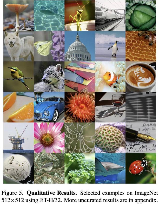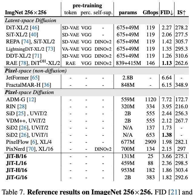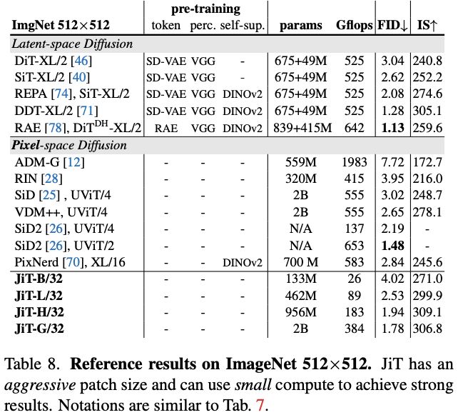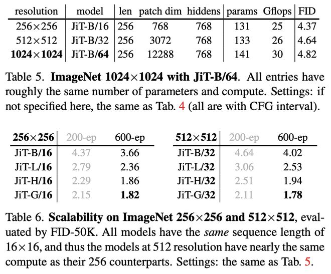 在高分辨率像素生成上,表 5 表明 JiT 无惧维度灾难; 表 6 则验证了 JiT 的可扩展性。