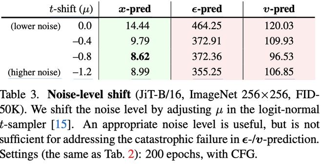 原因在于:ϵ和v包含高维噪声信息,对模型容量要求极高,而x预测只需保留低维干净数据结构,更容易学习;这与前文玩具实验的发现一致(图2)。