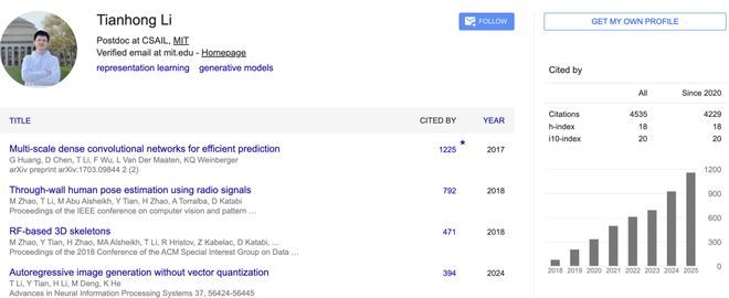 目前,他是麻省理工学院计算机科学与人工智能实验室(MIT CSAIL)的博士后研究员,导师是何恺明。