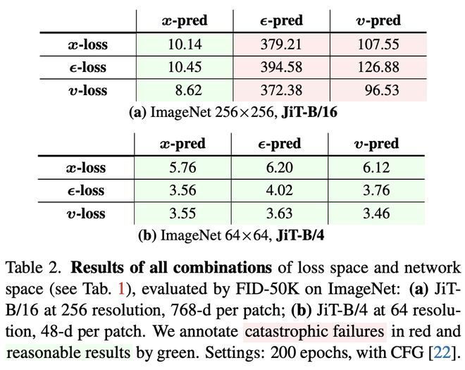 在高维设定(表2(a),ImageNet 256×256,JiT-B/16,Patch 维度为 768)中,只有x预测在三种损失函数下都表现稳定,FID 最低为8. 62;