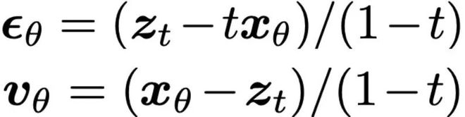 扩散模型的预测,可以在三个不同空间中进行:x空间(即干净图像)、ϵ空间(噪声)或v空间(流速)。