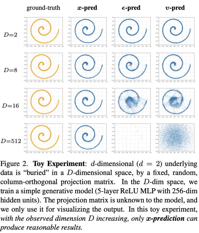 此外,如图 2 所示,作者通过一个玩具实验展示:当原始低维数据被嵌入更高维空间后,只有x预测仍能稳定生成合理输出,ϵ与v预测则迅速退化。