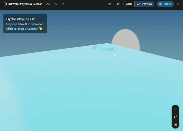 制作一个逼真的水物理测试场景,完全 3D 可交互,具备动态反射与波浪效果,并可点击任意位置将柠檬投入水中。