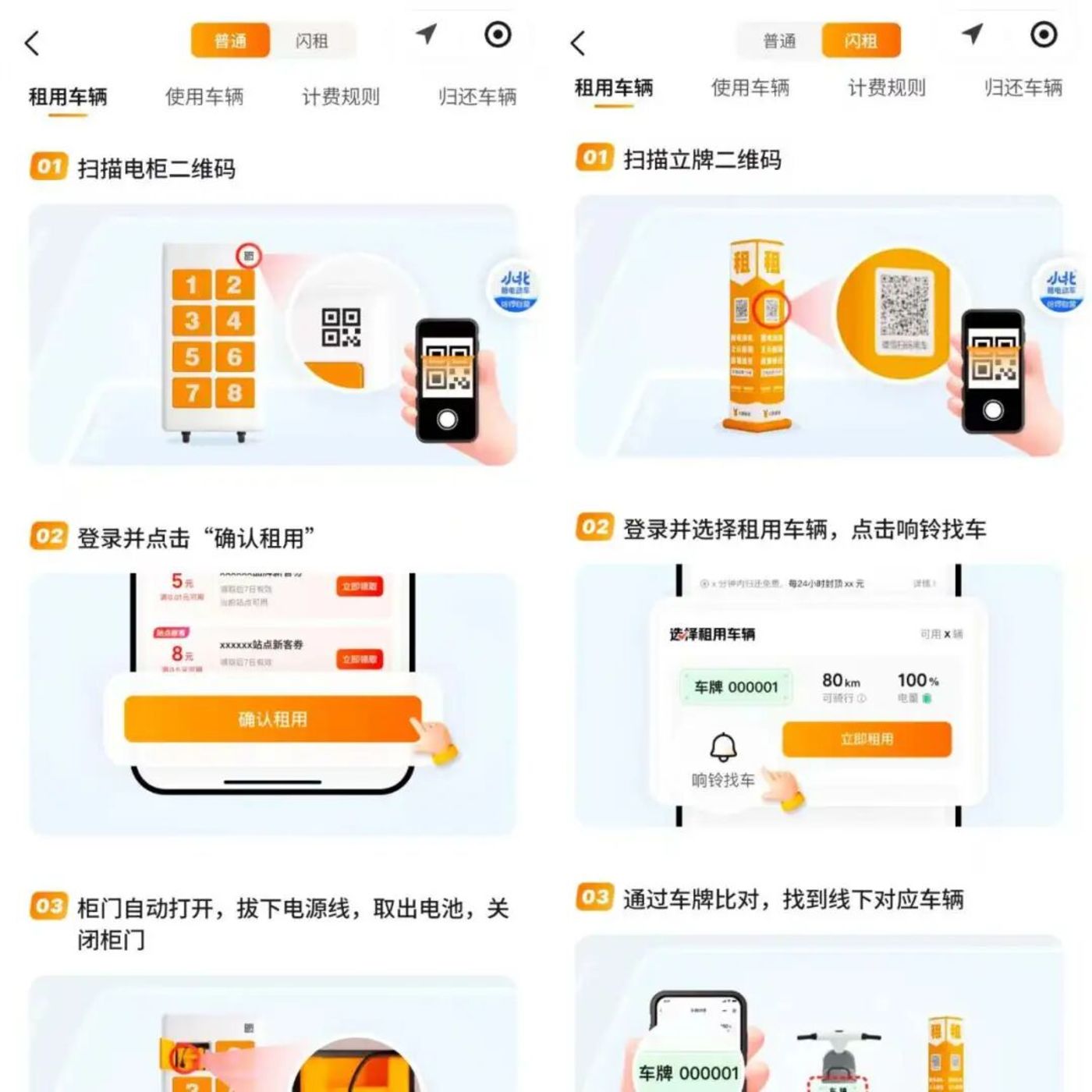 闪租则在步骤上更加便捷,到大鹿租车站点,找到立牌扫码,并选择租用车辆,点击响铃找车,通过车牌对比,找到站点的对应车辆即可骑行。归还时,也是将车骑行到原站点的指定位置,点击“去还车”即可。
