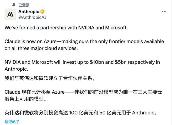 昨晚,Anthropic 发文宣布,将使用微软 Azure 的英伟达 GPU 训练 Claude 新模型,并使用 Azure 托管 Claude 模型。