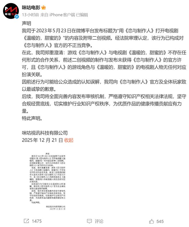 12 月 21 日消息,“咪咕电影”发布一则道歉声明,针对 2023 年咪咕在微博平台发布标题为“用《恋与制作人》打开电视剧《温暖的,甜蜜的》”的内容及附带二创视频,向《恋与制作人》官方及全体玩家道歉。声明提到,上海知识产权法院审理认定,咪咕在 2023 年发布的一则视频构成了对《恋与制作人》官方的不正当竞争。《恋与制作人》转发该声明并表态。