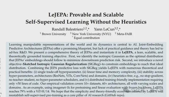 LeJEPA 核心提出了一种基于各向同性高斯嵌入的自监督学习方法,通过引入 SIGReg 正则化,有效解决了表示崩溃问题,并显著提升了模型的泛化能力。