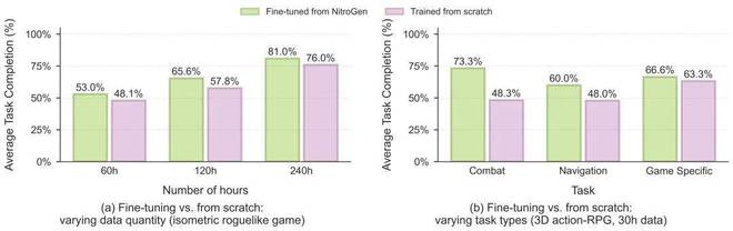 更重要的是,NitroGen 能够有效迁移到从未见过的新游戏。在相同任务设定下,其任务成功率相比从零开始训练的模型,最高可实现 52% 的相对提升。