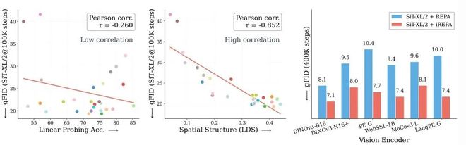 分类能力与生成质量几乎无关,空间结构却高度相关。左:线性探测准确率与生成 gFID 的相关性极弱(Pearson r=-0.26)。中:空间结构指标(LDS)与生成质量呈现出显著强相关(Pearson r=-0.85)。右:基于空间结构改进的 iREPA,在多种编码器上稳定优于 REPA。
