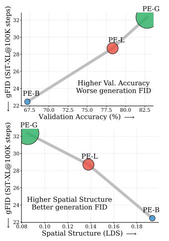 先看一个已经被反复验证的事实:一个模型在 ImageNet 上的线性探测准确率越高,并不意味着它更适合用来做生成。