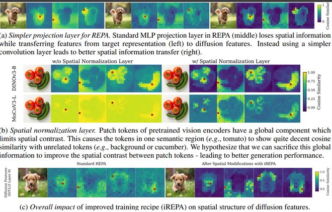 iREPA 如何通过两处修改,恢复生成所需的空间结构。 (a) 使用卷积投影替代 MLP,可更好地保留局部空间关系。 (b) 空间归一化层通过移除全局分量,提高 patch 之间的空间对比度。 (c) 经过这两步修改后,iREPA 生成的 diffusion 特征呈现出更清晰的空间结构。