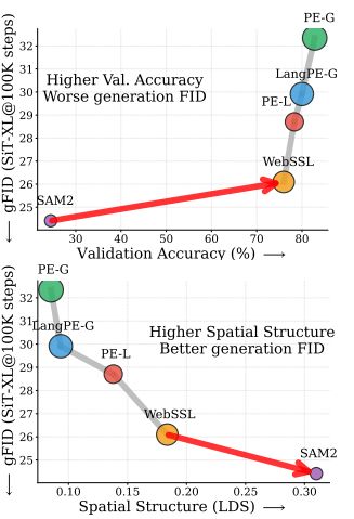 但当这些编码器被用于 REPA 时,SAM2 的生成质量反而优于一批准确率高出约 60% 的模型。