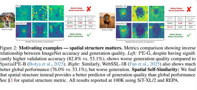 PE-G 和 WebSSL-1B 在 ImageNet 上具有更高的分类准确率,但它们的空间自相似性显示,前景与背景被过度拉近,边界模糊。相比之下,空间结构更清晰的 SpatialPE-B,生成质量显著更好。