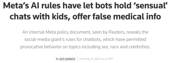 2025 年 8 月,Meta 内部政策文档被曝光:允许 AI 聊天机器人与未成年人进行「感性」等话题互动,提供虚假医疗信息。
