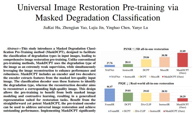 A:MaskDCPT 是北京大学团队提出的一种新的图像修复预训练方法。传统方法通常需要针对每种图像问题(如去雨、去雾)单独训练一个模型,而 MaskDCPT 通过让模型同时学习识别问题类型和修复问题,训练出一个能处理多种问题的通用模型。它的核心创新是发现了问题识别和图像修复这两个任务是互相促进的。