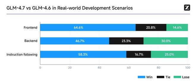 为了验证 GLM‑4.7 在实际开发任务中的表现,智谱对比测试了 100 个真实编程任务,覆盖前端开发、后端逻辑以及指令遵循等三个核心方向。结果显示,在前端任务中,GLM‑4.7 相较 4.6 版本胜率提升至 64.6%,在指令遵循场景中也达到 58.3%。在最具工程复杂度的后端方向,其胜率也稳定在 46.7%。