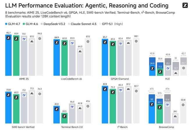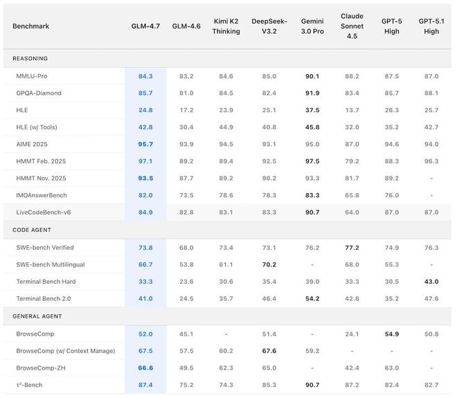 从更细致的基准测试来看,GLM-4.7 最明显的升级集中在三个方面:代码、工具调用和推理能力。