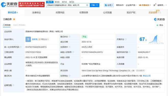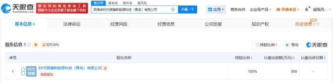 雷达财经讯,天眼查工商信息显示,近日,西海岸时代骐骥新能源科技(青岛)有限公司成立,法定代表人为李军亮,注册资本 500 万人民币,经营范围包括新兴能源技术研发、新能源汽车换电设施销售、在线能源计量技术研发、新能源汽车整车销售等。股东信息显示,该公司由宁德时代旗下时代骐骥新能源科技(青岛)有限公司全资持股。
