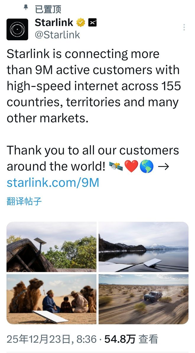 美国 SpaceX 旗下“星链”当地时间 12 月 22 日发布消息称,“星链”服务已连接超过 900 万活跃用户,在 155 个国家、地区和许多其他市场提供高速互联网服务。