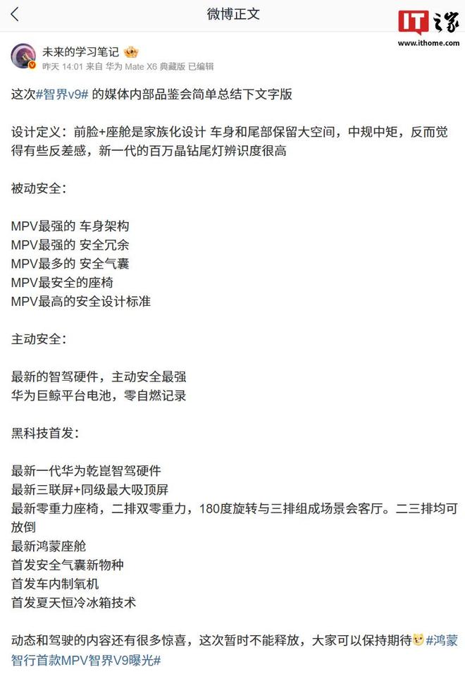 IT 之家注意到,博主 @未来的学习笔记昨日发文总结并进一步曝光了鸿蒙智行首款旗舰 MPV —— 智界 V9 的配置信息,主要包括设计、安全、黑科技等,具体如下: