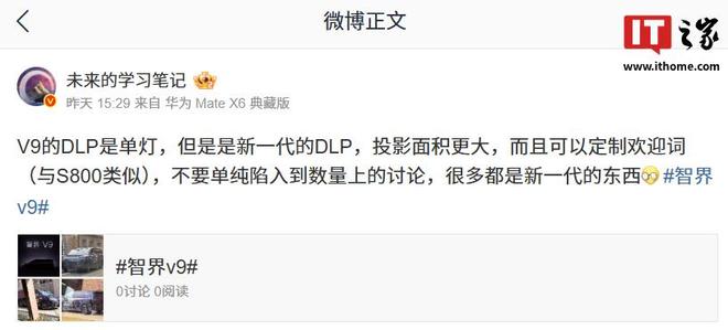 另外,博主还透露,智界 V9 的 DLP(此处预计指用于汽车外部照明的 DLP 动态地面投影技术)是单灯,但是是新一代的 DLP,投影面积更大,而且可以定制欢迎词,与尊界 S800 类似。