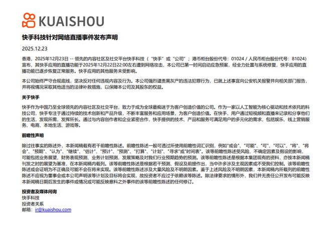 12 月 23 日午间,快手官方发布公告,将这场史无前例的内容安全溃败,定性为“黑灰产攻击”,并称公司已第一时间启动应急预案,经全力处置与系统修复,直播功能已逐步恢复正常。