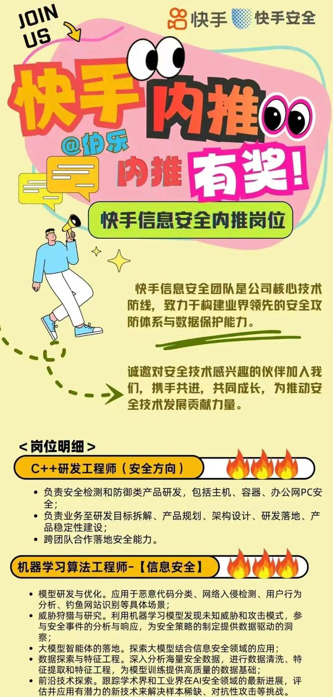 据招聘海报介绍,快手的信息安全团队作为公司核心技术防线,致力于打造业内领先的安全攻防体系与数据保护能力。