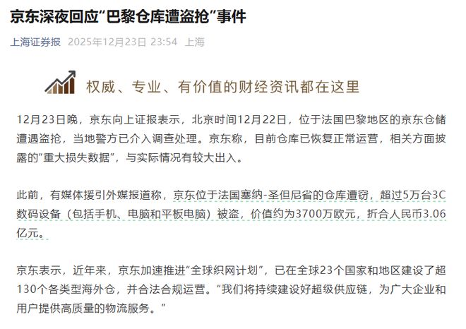 12 月 24 日消息,昨天大家应该有刷到京东法国仓库失窃的新闻。仓库被专业团伙洗劫,网传损失超 3 亿人民币。