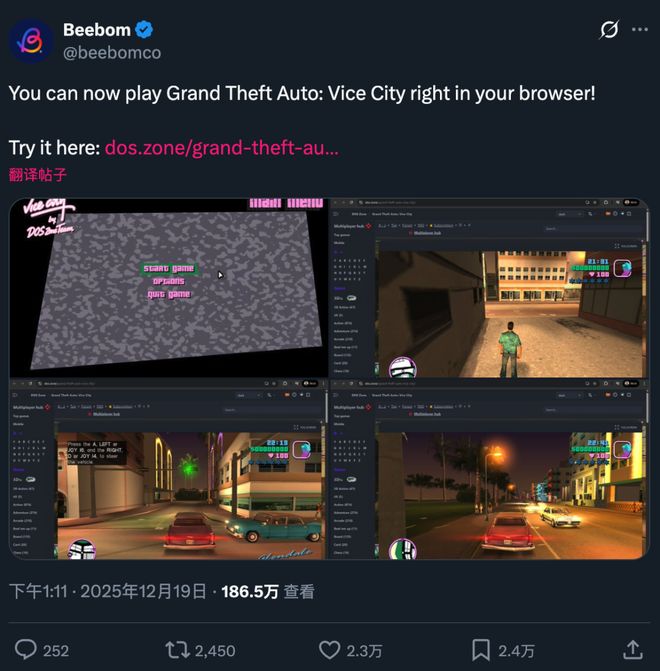 起因是一个叫 beebom 的博主发了个推文,说你能在浏览器里玩罪恶都市了。