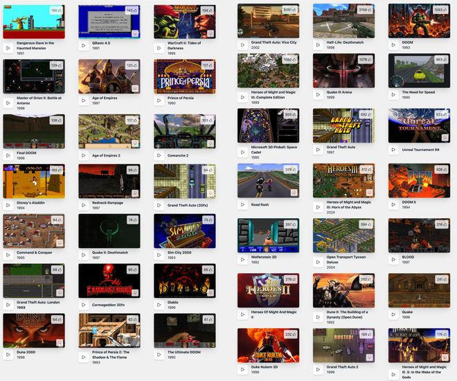 这网站一共移植了 2000 多款经典游戏,从上世纪 80 年代的到 2000 年初的童年回忆应有尽有,什么三维弹球、暴力摩托、DOOM、极品飞车。