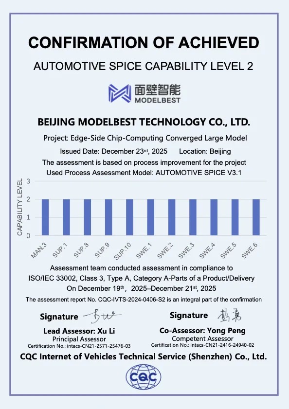 昨天,面壁智能官宣通过 ASPICE L2 车规级国际认证,成为国内首家通过该认证的大模型企业。