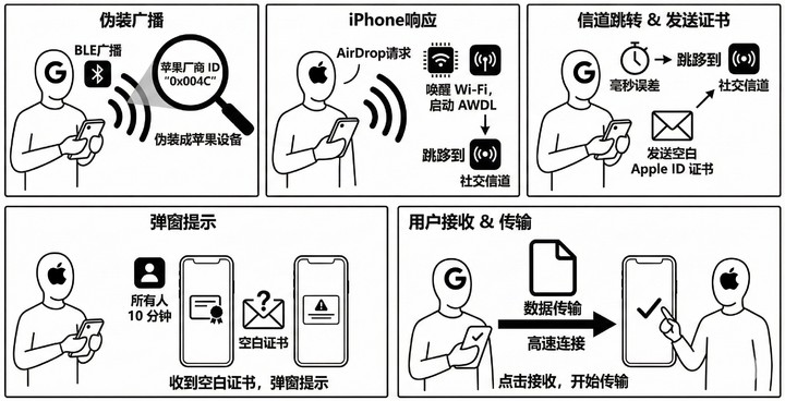 - iPhone 捕捉到 BLE 信号,看到厂商 ID 确认是一个 AirDrop 服务请求,唤醒 Wi-Fi 芯片、启动 AWDL 服务搜寻附近主节点广播的同步帧,并跳转到社交信道上等待接收验证证书
