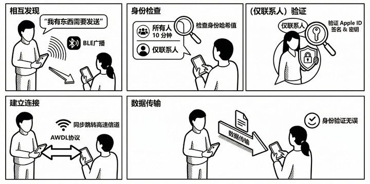 除此之外,由于 AirDrop 还需要区分「所有人 10 分钟」以及「仅联系人」两种模式,单纯依靠 BLE 发现、收听 AWDL 频率、同步跳转社交信道,在安全性上还有所欠缺。