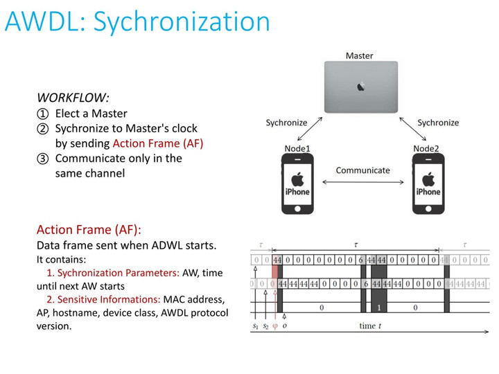 由于 AWDL 用于广播和跳变社交信道的时间窗口非常狭窄,对于同一个 AWDL 集群中的所有子设备监听来自主节点的同步帧、调整自身时钟和跳转社交信道的误差精度都在几毫秒以内,这些都离不开软硬件的协同开发。