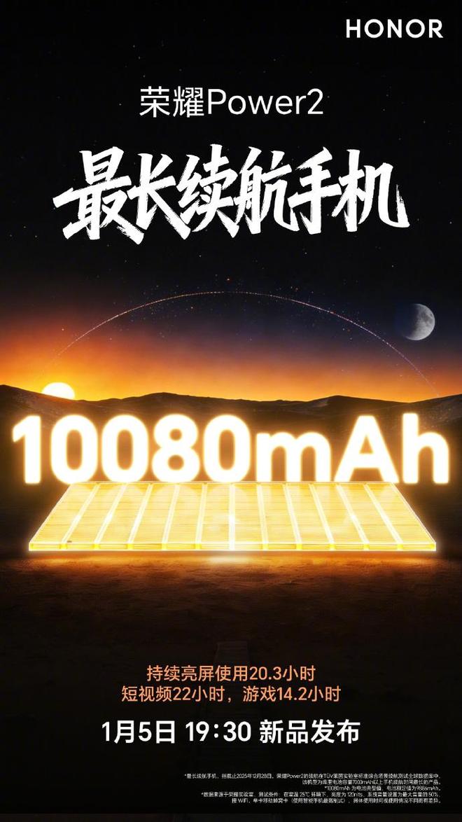 IT 之家 12 月 29 日消息,今日,荣耀官宣 Power2 将于 2026 年 1 月 5 日新品发布。作为 2026 年开年之作,荣耀 Power2 最引人瞩目的焦点,在于搭载的第四代青海湖电池容量直破万级,达到史上最大的 10080mAh,加速推进了万级毫安时普及进程,打破了手机续航领域又一新纪录。从官方信息上可以看出,此次还搭载天玑 8500 Elite 超强芯片。