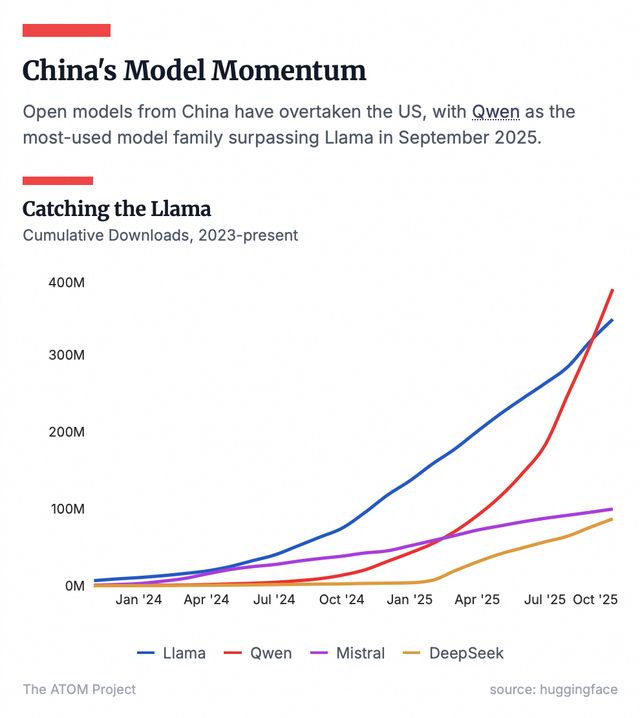 根据全球最大的 AI 开源社区 HuggingFace 数据,中国开源模型的下载量在 2025 年 7 月已经超过美国,其中阿里千问位居第一;海外模型 API 调用第三方平台 OpenRouter 数据也显示,千问在今年异军突起,调用量一度冲至所有开闭源模型的全球第四。