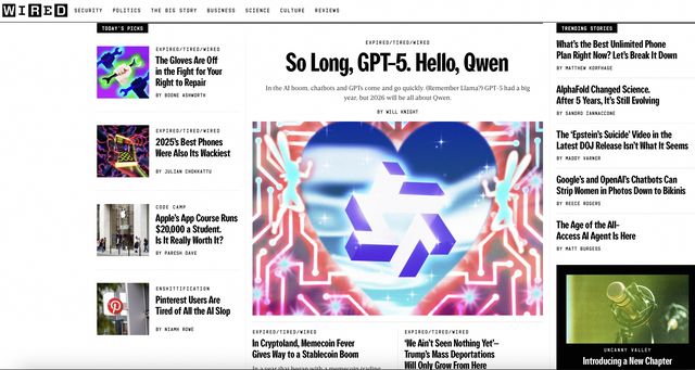 12 月 29 日,美国著名科技媒体《连线》(WIRED)发表头条文章《再见,GPT-5。你好,千问》,文章指出,GPT-5 未能激起市场热情,而开源开放的阿里千问,性能优异,适于灵活部署应用,2026 年将属于千问。“衡量任何 AI 模型价值的关键标准,不应仅限于其‘聪明’程度,更应看它被用于构建其他应用的广度。若以此为尺度,千问等中国开源大模型无疑正处于上升势头。”
