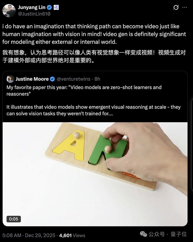 比如,阿里最年轻 P10、Qwen 大模型技术负责人林俊旸最新转发了一篇名为《Video models are zero-shot learners and reasoners》的研究。