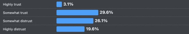 明确表示「不信任」AI 准确性的开发者远多于「信任」的开发者,而表示「高度信任」的仅占 3.1%。