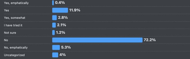 但调研显示,绝大多数开发者(72.2%)并未参与这种非严谨的开发模式,另有5% 的人强调这不属于专业工作范畴。
