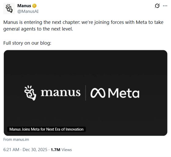 12 月 30 日,Meta 宣布收购 AI 应用 Manus 的母公司蝴蝶效应。这家 AI 智能体公司由中国人创立,总部位于新加坡,主打为付费用户提供深度调研及其他各类任务的执行服务。